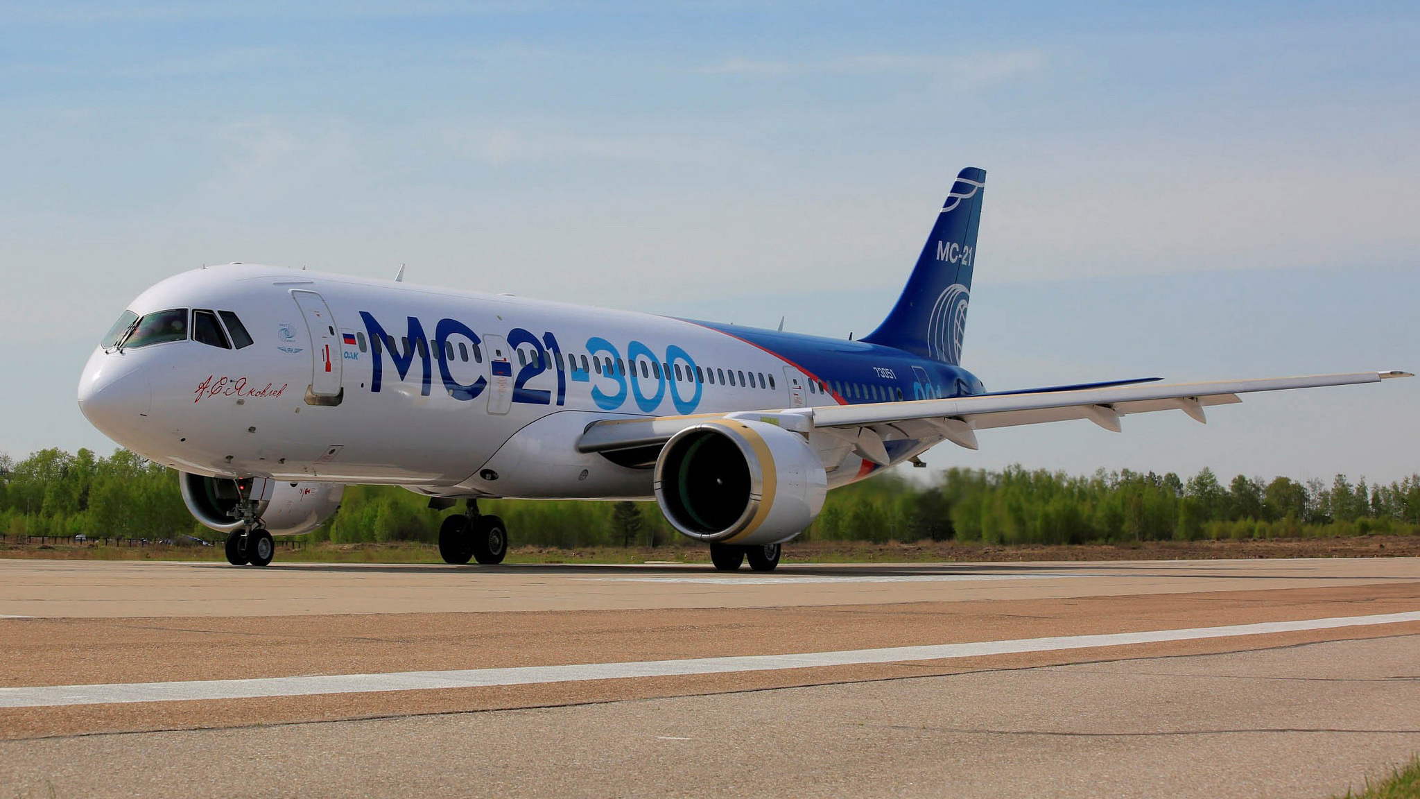 Description: A large jetliner sitting on top of an airport runway next to a forest of trees and grass on a sunny day.