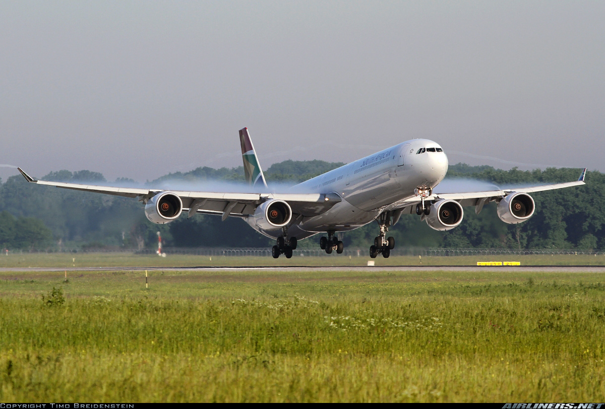 Description: A large jetliner taking off from an airport runway with smoke coming out of it's engines and landing gear.