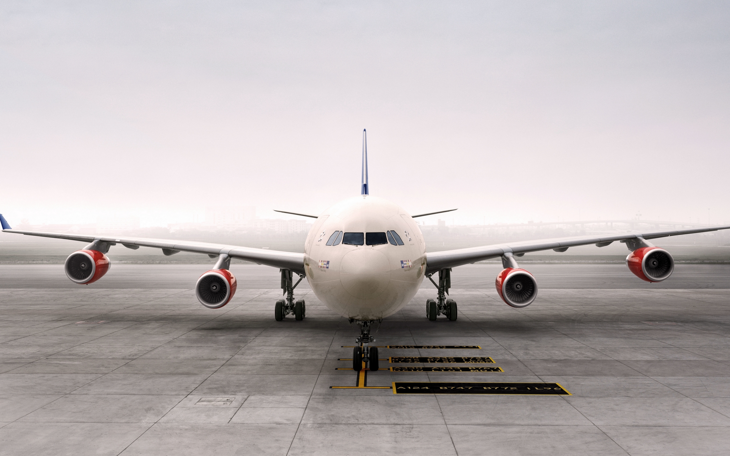 Description: A large jetliner sitting on top of an airport tarmac with a sky background and a few clouds.