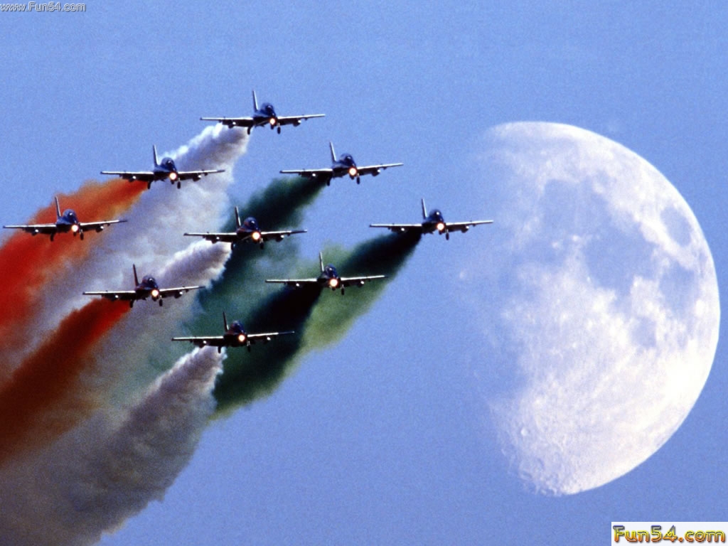 Description: A group of jets flying in formation in front of a full moon with smoke trailing from the tails of the jets.