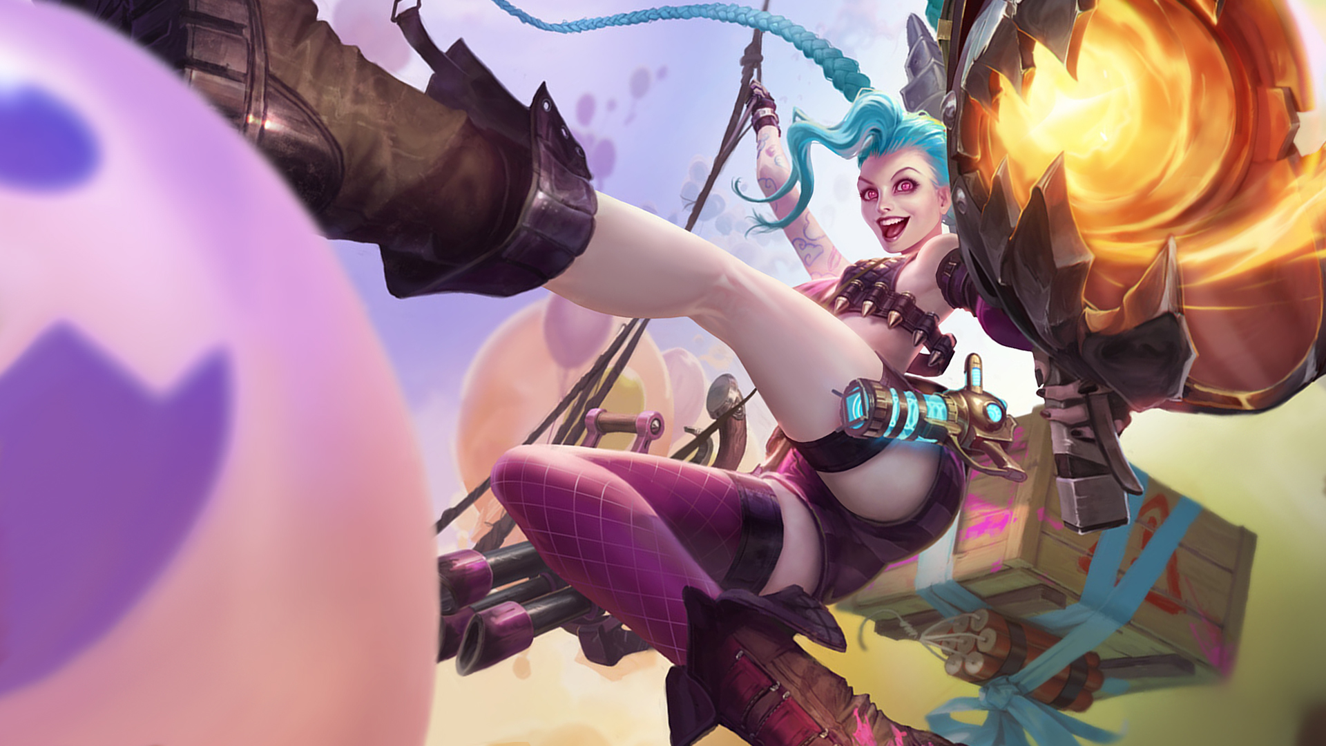 Description: A woman in a costume is holding a gun and a ball in the air with a giant egg in the background.