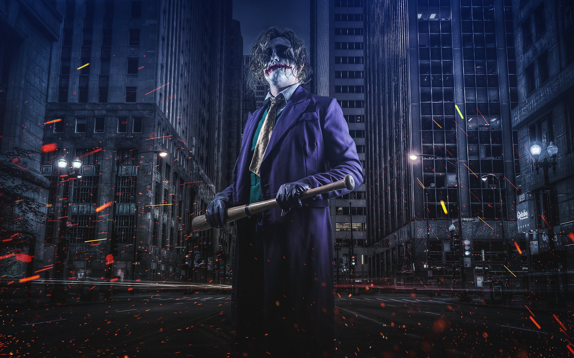 Description: A man dressed in a joker costume holding a bat in a city at night with fireworks flying around him.