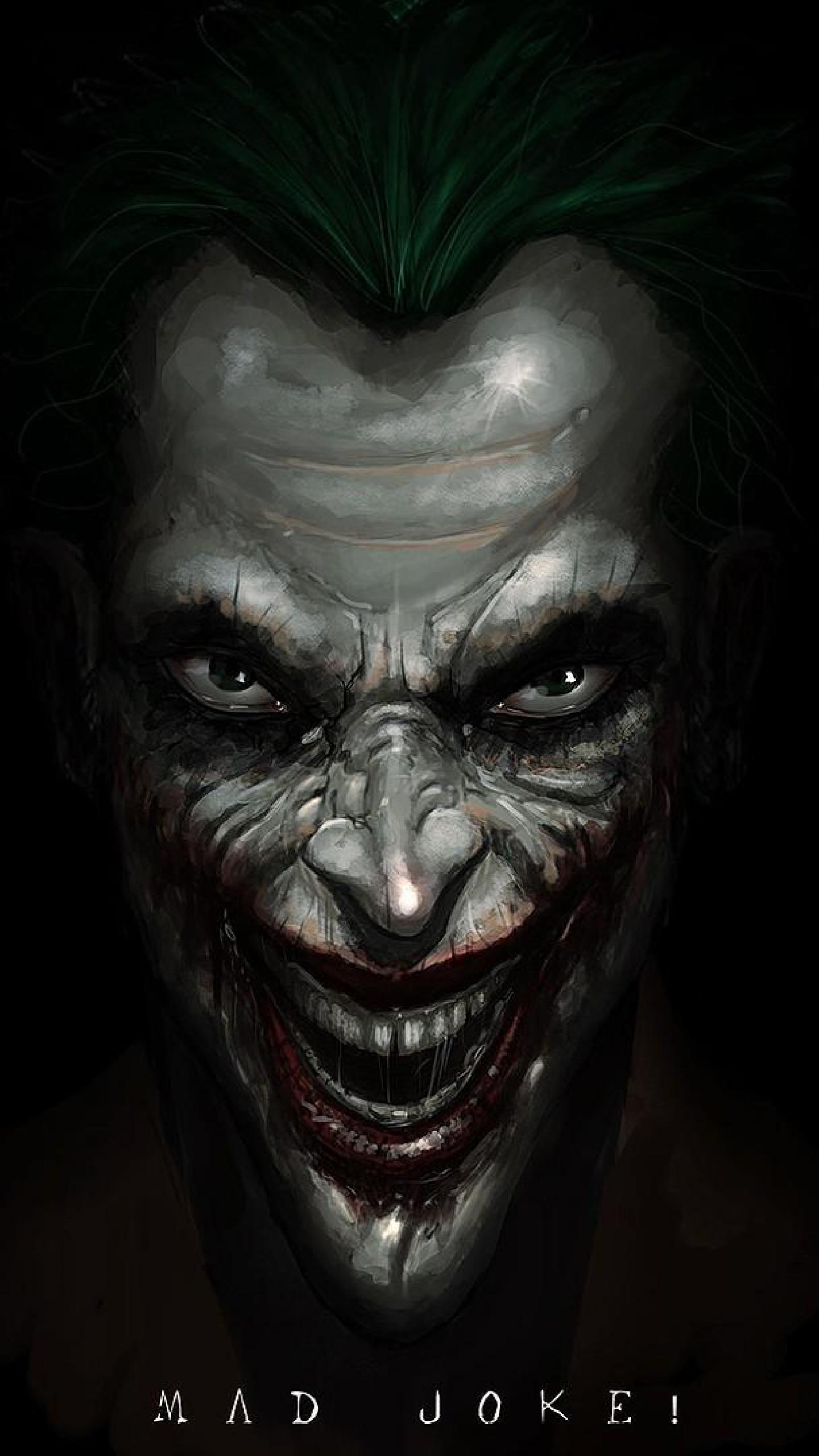 Description: A close up of a joker face with green hair and a green mohawk on it's head and the words mad joke.