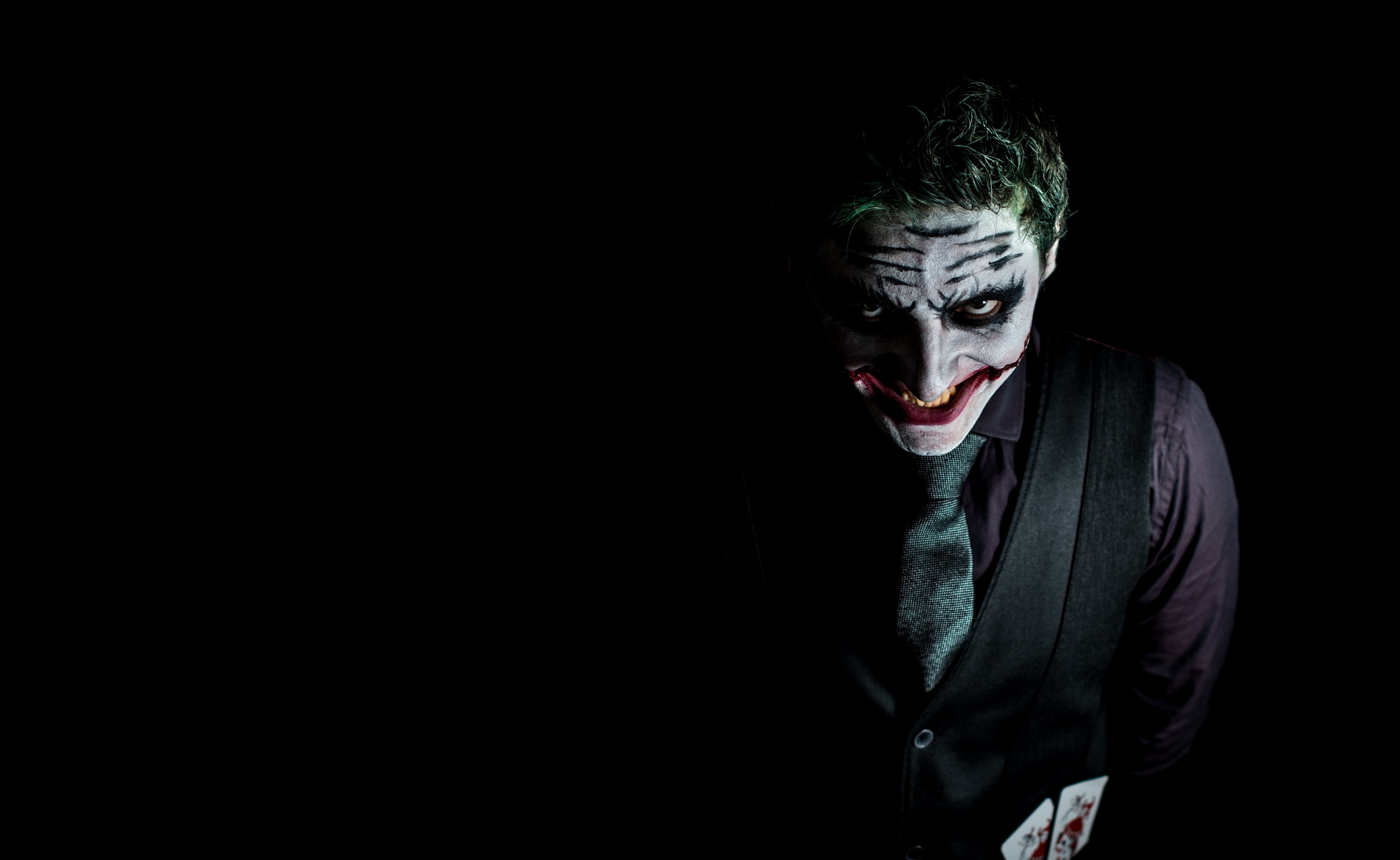 Description: A man dressed as the joker in a dark room with a black background and a black background with a white face.