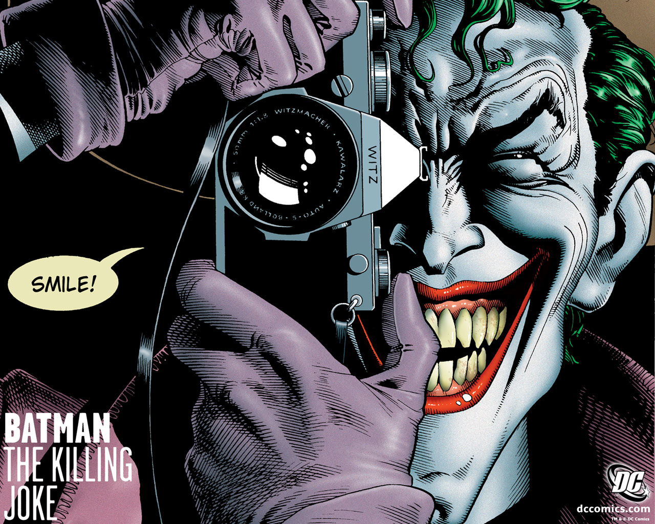 Description: A comic book cover with a joker taking a picture of himself with a camera and a comic strip about the joker.
