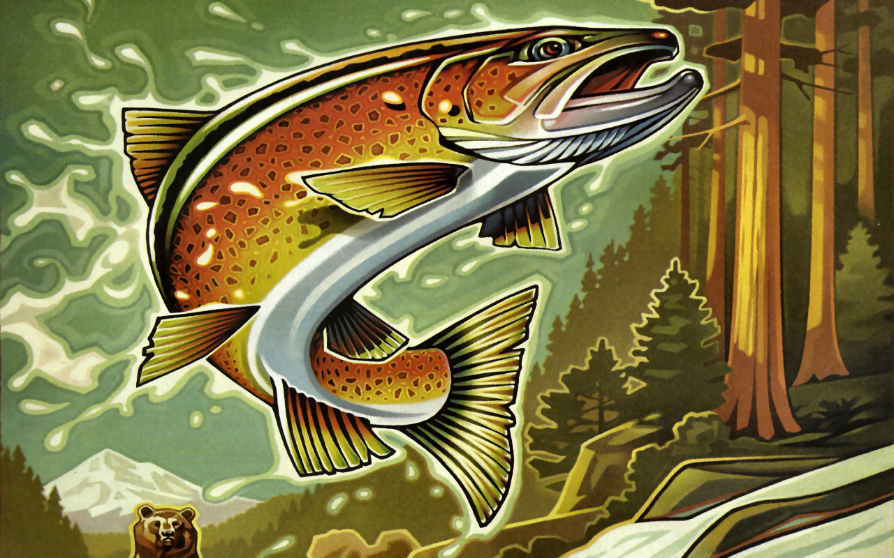 Description: A painting of a fish jumping out of the water to catch a fish in the air with a bear nearby.