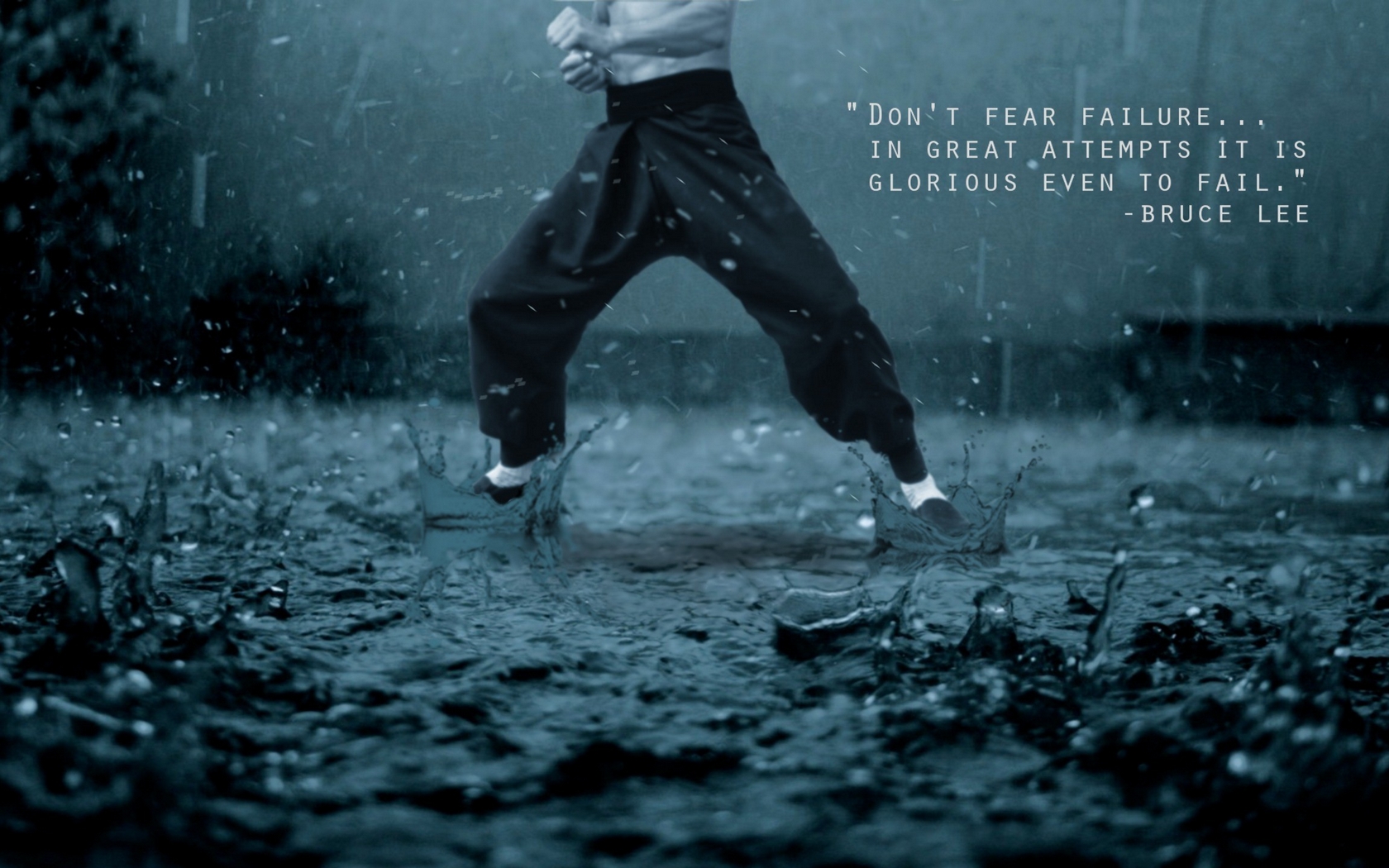 Description: A man is jumping in the rain with an umbrella over his head and a quote on the side of the picture.