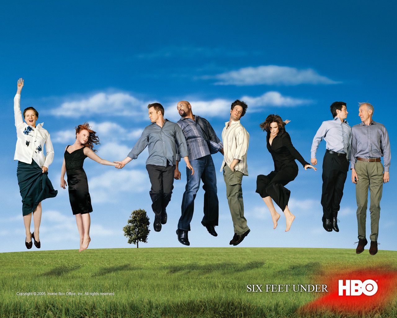 Description: A group of people jumping in the air in front of a blue sky with clouds and a tree in the foreground.