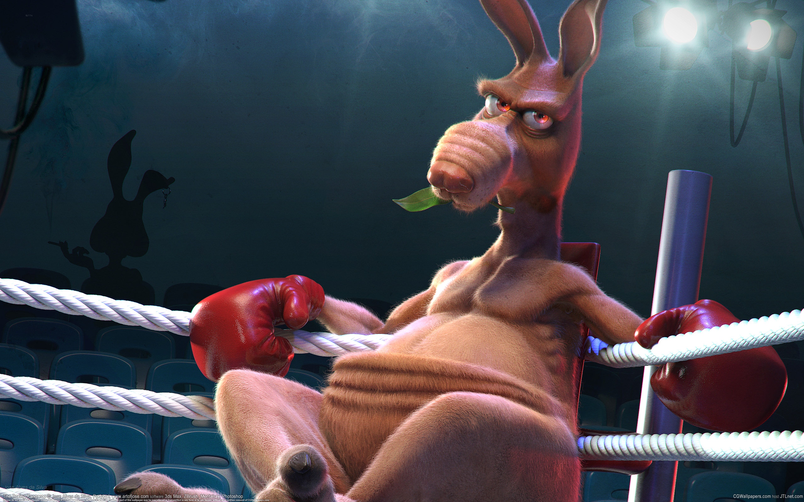Description: A kangaroo is boxing in a boxing ring with a green leaf in its mouth and a boxing glove in his mouth.