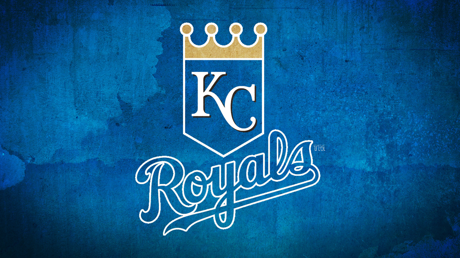 Description: A kansas royals logo on a blue background with a crown on top of it and the word royals in white.