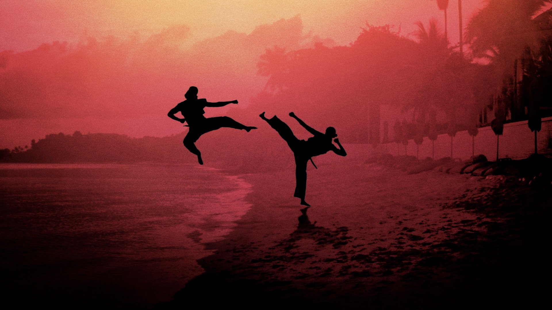 Description: Two people doing karate on a beach at sunset or sunrise time.