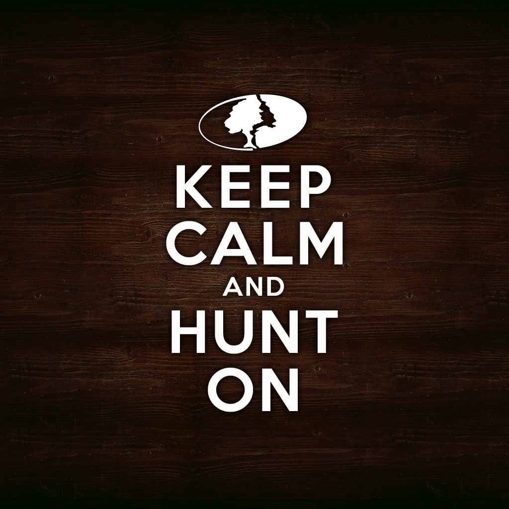 Description: A wooden sign that says keep calm and hunt on on it's side.