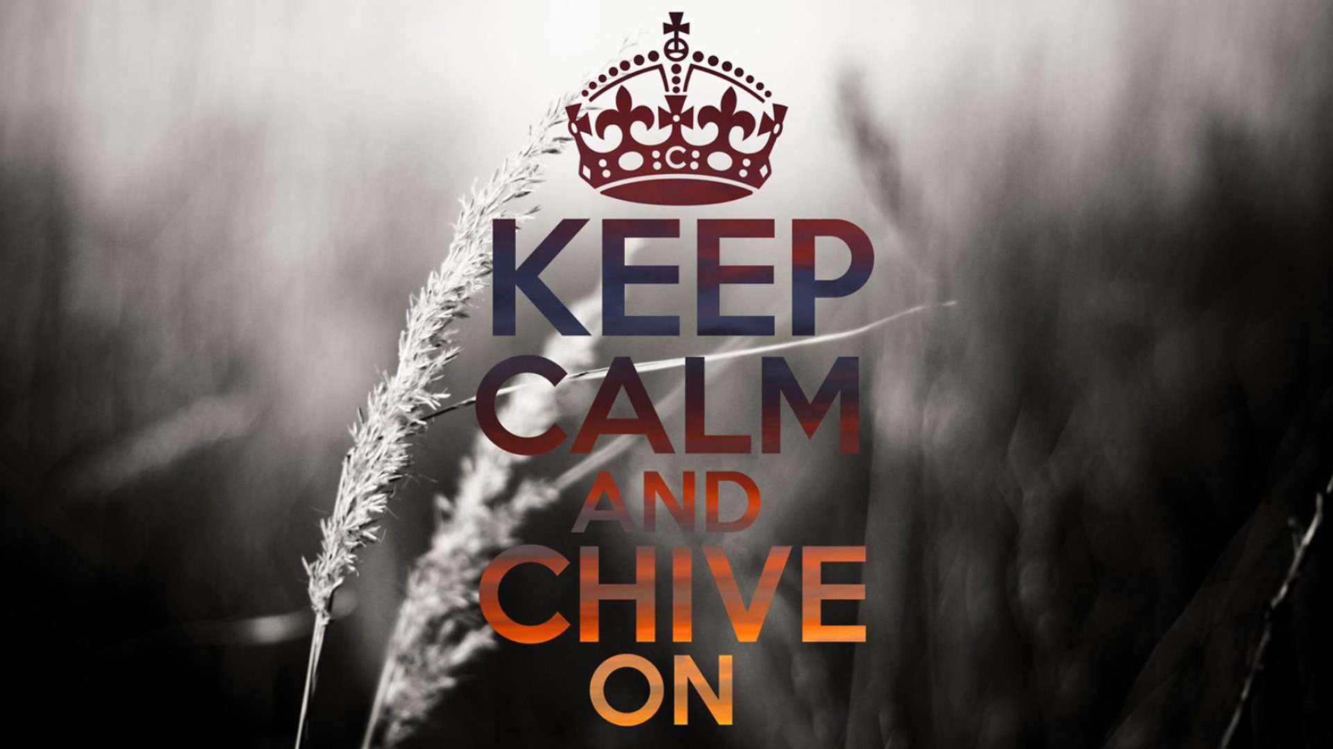 Description: A black and white photo with a crown on it and a message that reads keep calm and chive on.
