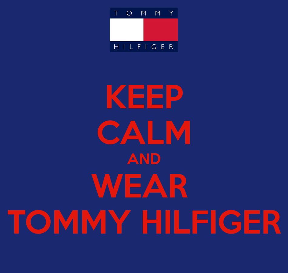 Description: A blue poster with a red and white stripe on it that says keep calm and wear tommy hilfiger.