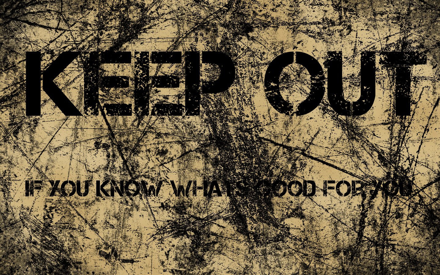 Description: A sign that says keep out if you know what food you are on it is grungy and black.