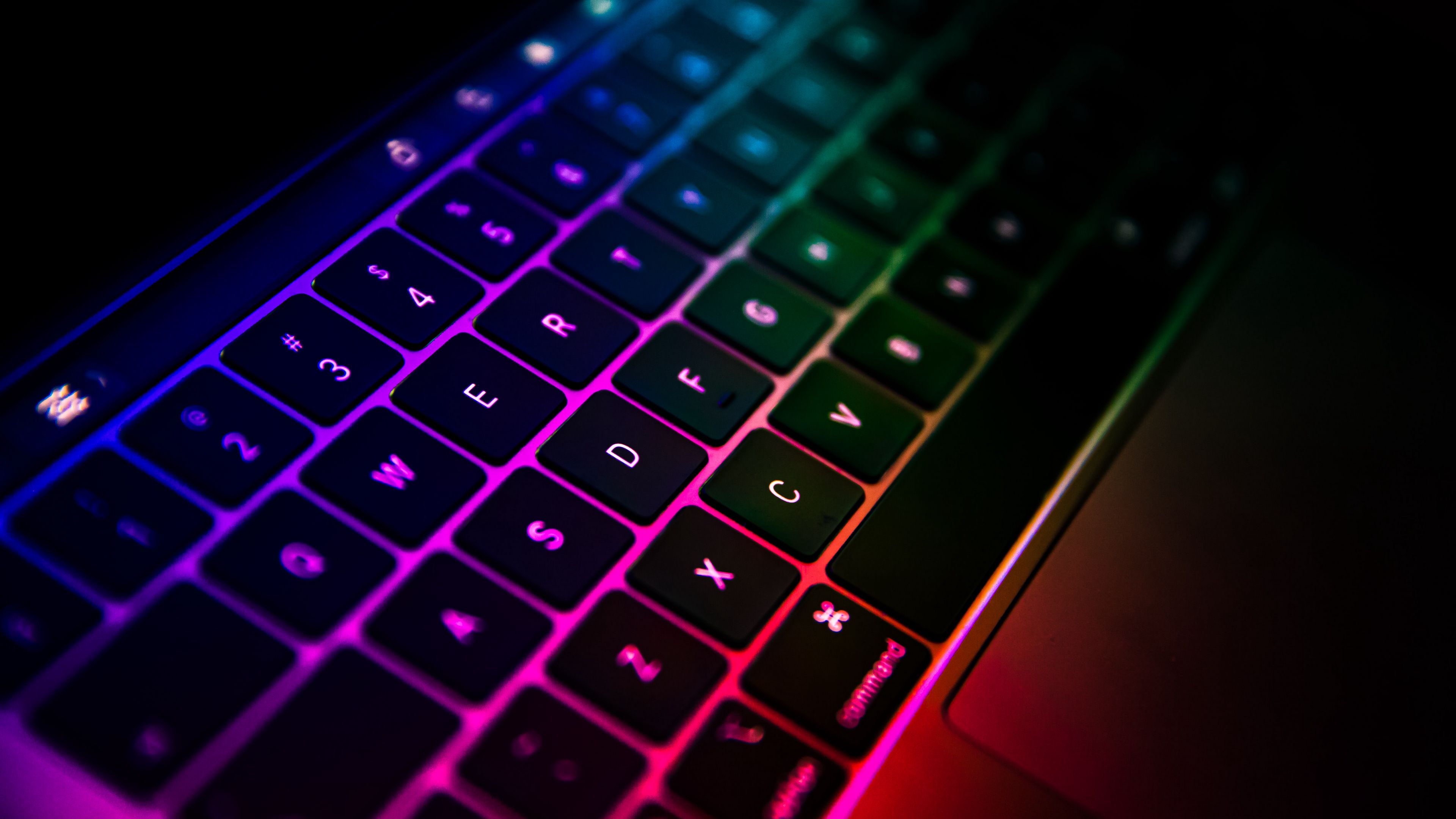 Description: A close up of a keyboard with a multicolored light on it's side and a black background.