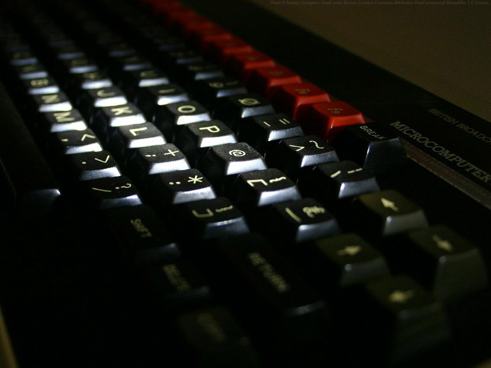 Description: A close up of a keyboard with a red and black key board on it's side and a black background.