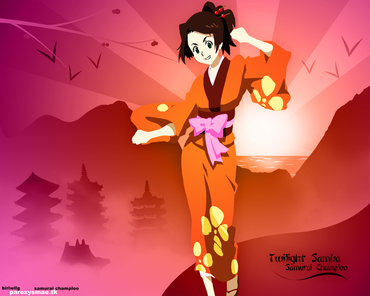 Description: A woman in a kimono dancing in the sunset with a mountain in the background and a pink sky.