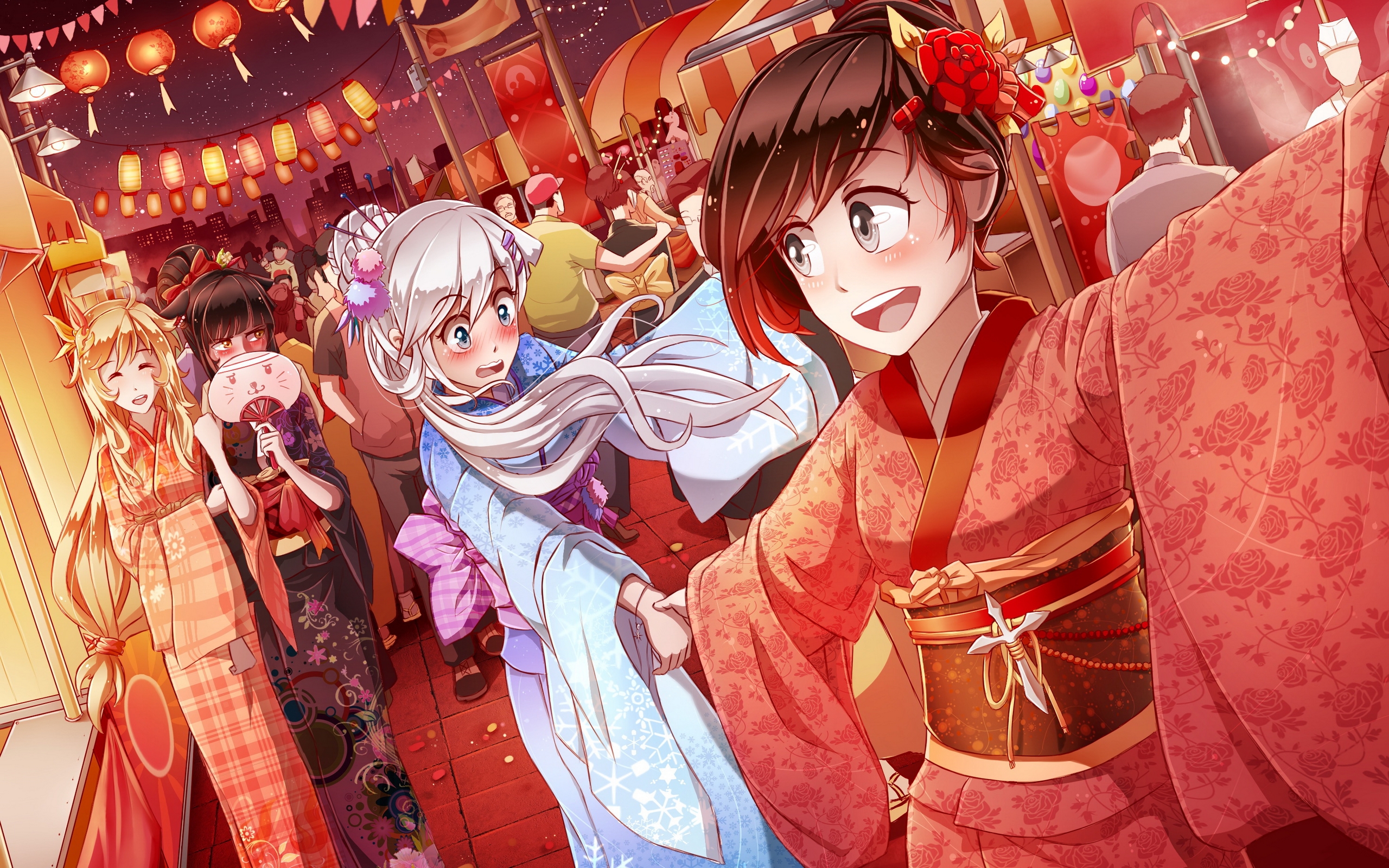 Description: A group of people in a room with a woman in a kimono and a man in a kimono.