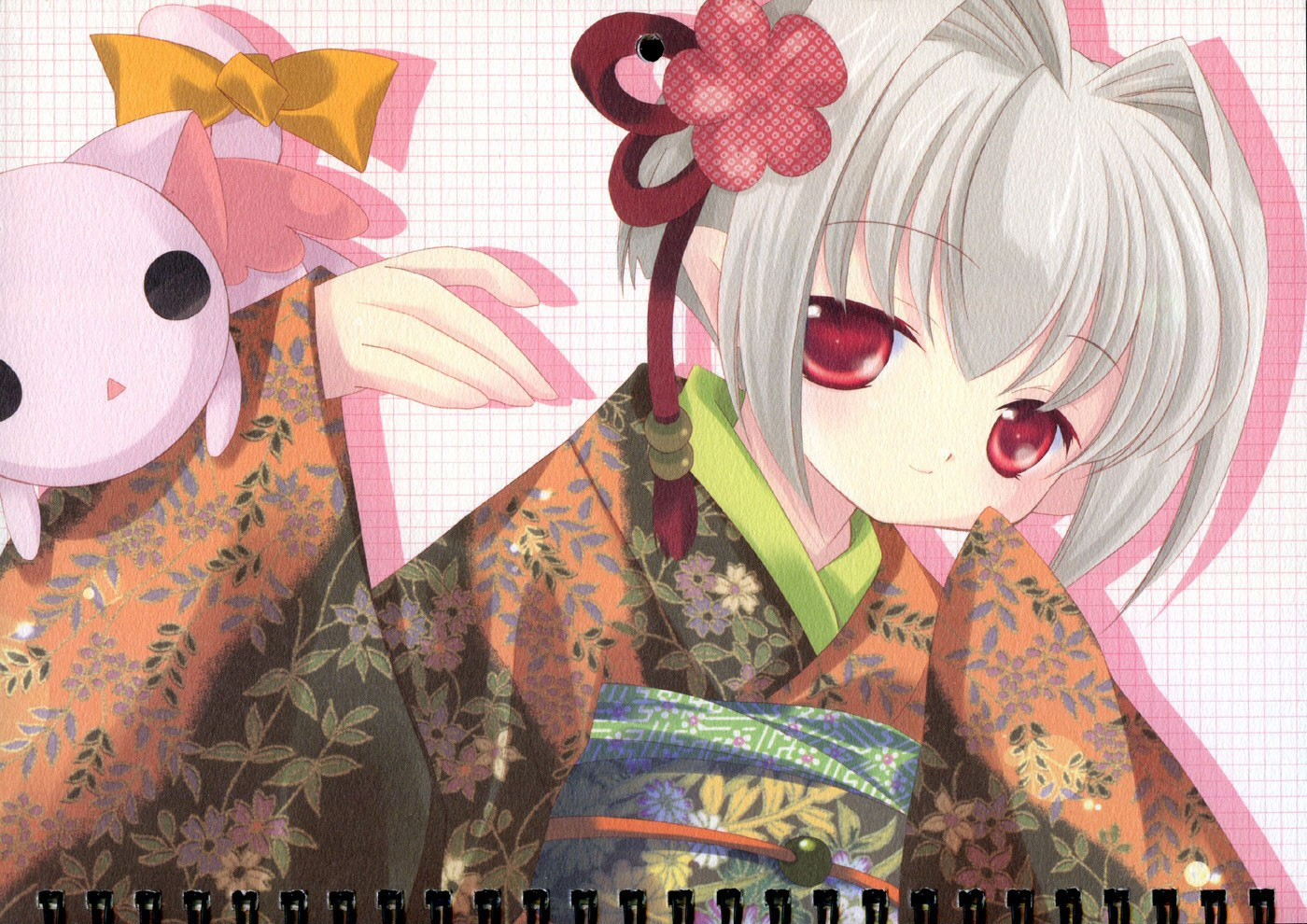 Description: A woman in a kimono holding a stuffed animal in her hand and a pig in her other hand.