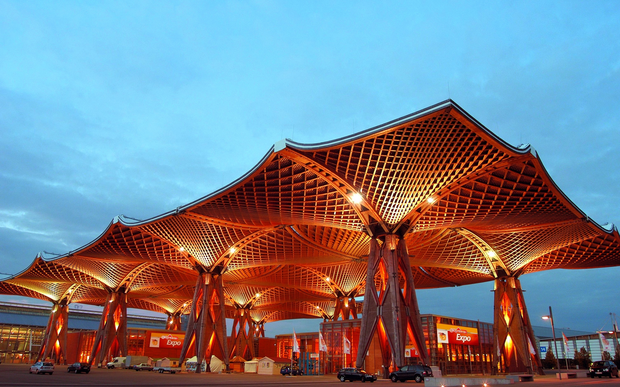 Description: A large building with a lot of lights on it's sides and a lot of columns on the sides.