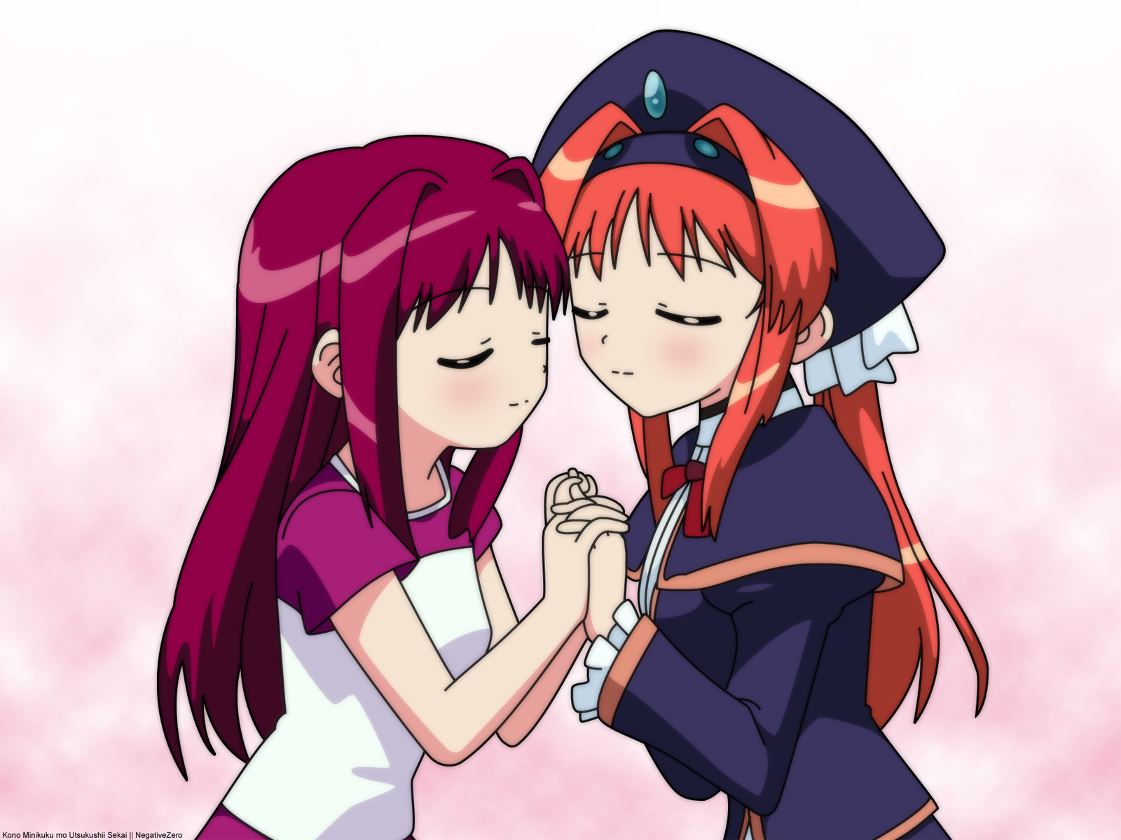 Description: Two anime characters are kissing each other with their eyes closed and their hands clasped together.