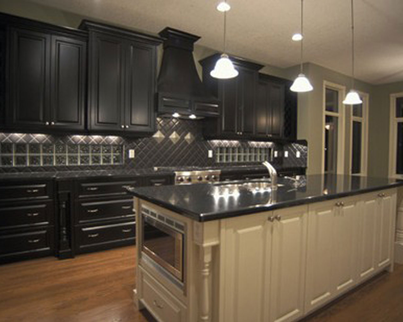 Description: A kitchen with a center island and black cabinets and a stove top oven and microwave oven in it and a wooden floor.
