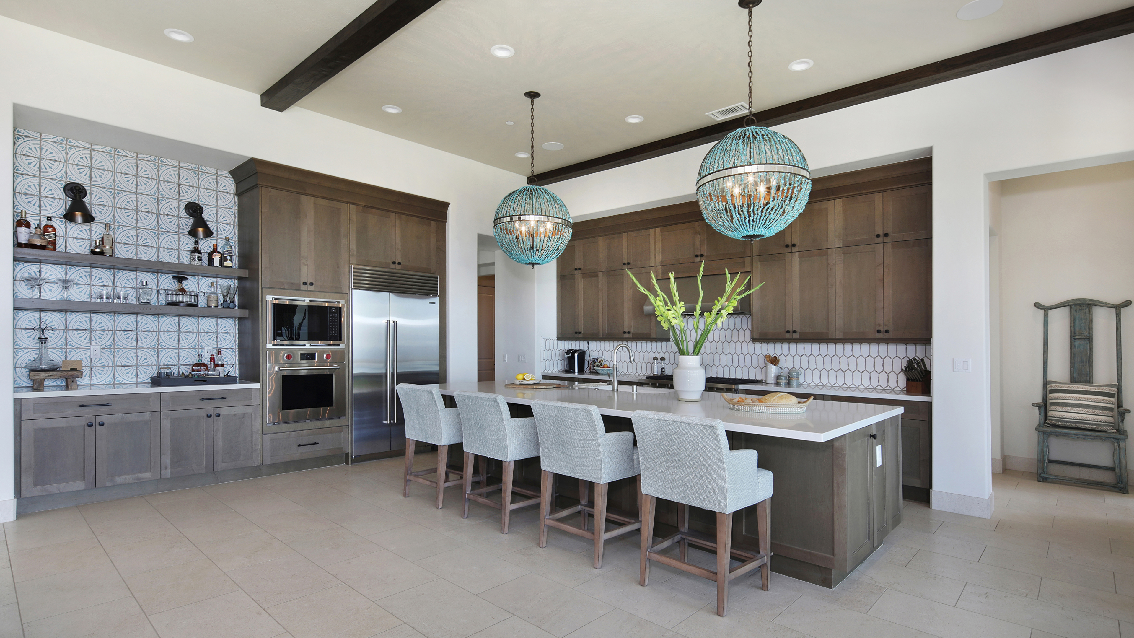 Description: A kitchen with a center island and a center island with chairs and a vase of flowers on it.