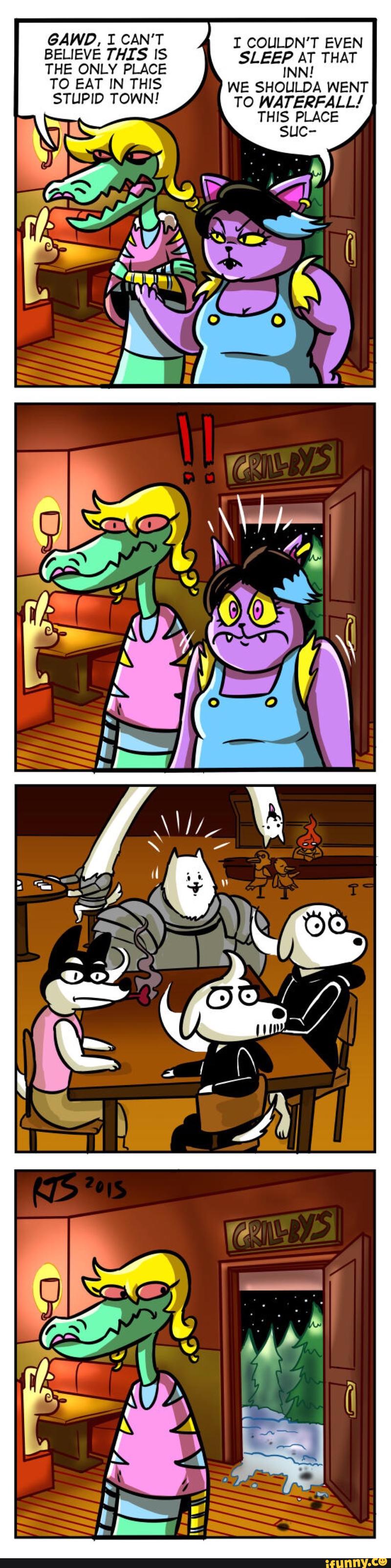 Description: A comic strip with a cartoon of a woman in a kitchen and a man in a pink shirt and a woman in a blue shirt.