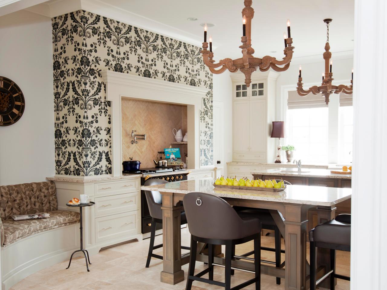 Description: A kitchen with a table and chairs and a clock on the wall above it and a bench with a bowl of fruit on it.
