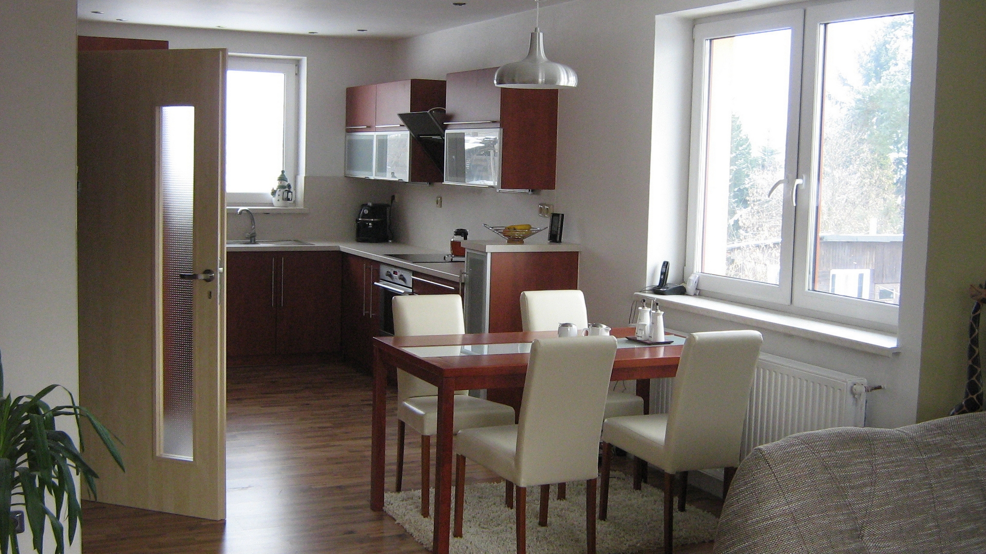Description: A kitchen with a table and chairs and a window with a view of the outside of the room and a couch.