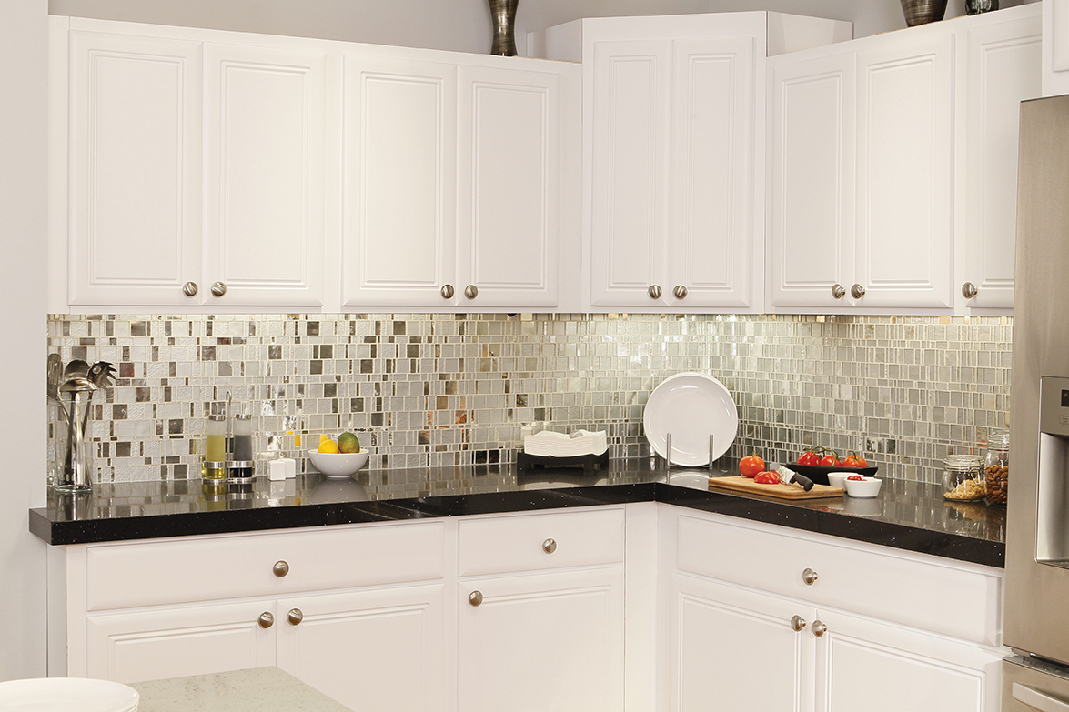 Description: A kitchen with white cabinets and black counter tops and a silver refrigerator and microwave oven with a dishwasher.