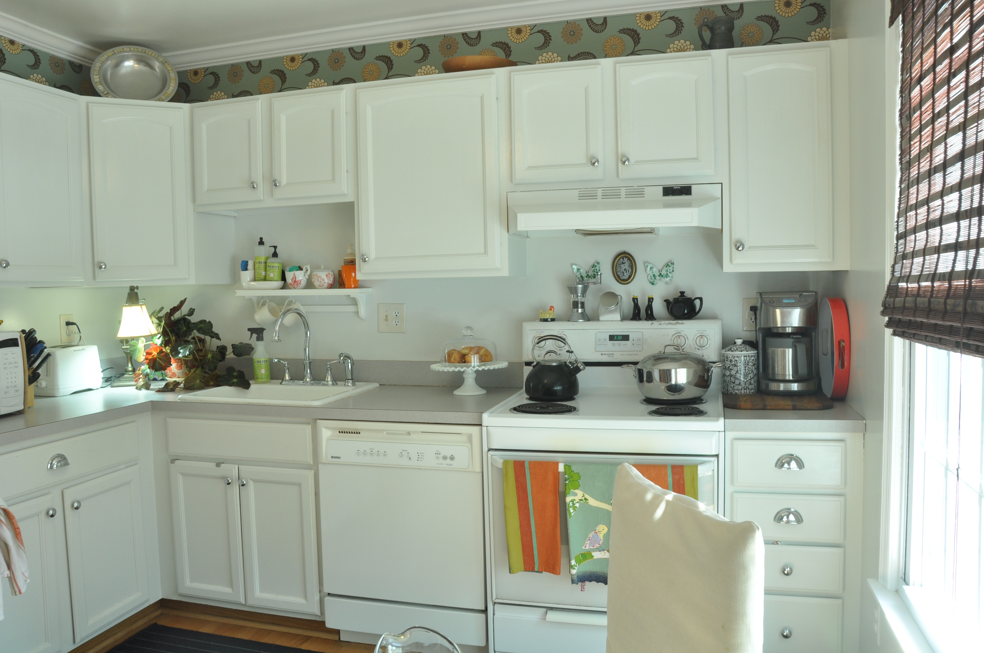 Description: A kitchen with white cabinets and a white stove top oven and a window with blinds on it and a white chair.