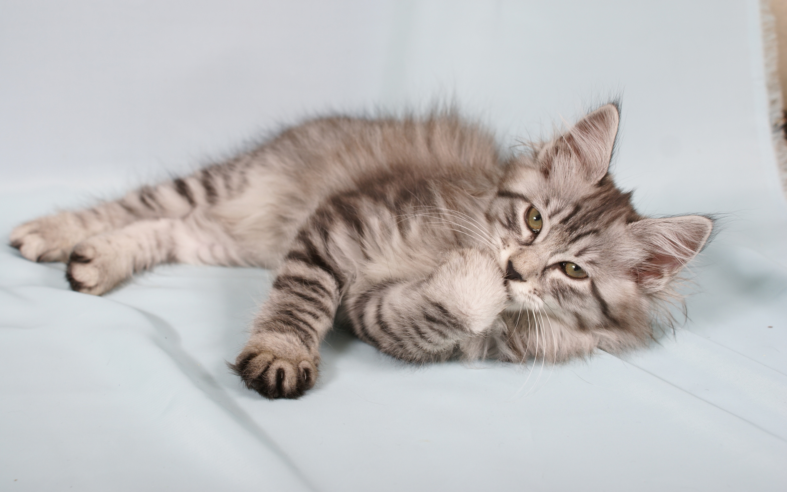 Description: A kitten laying on its back on a white surface with its paws on the ground and eyes open.