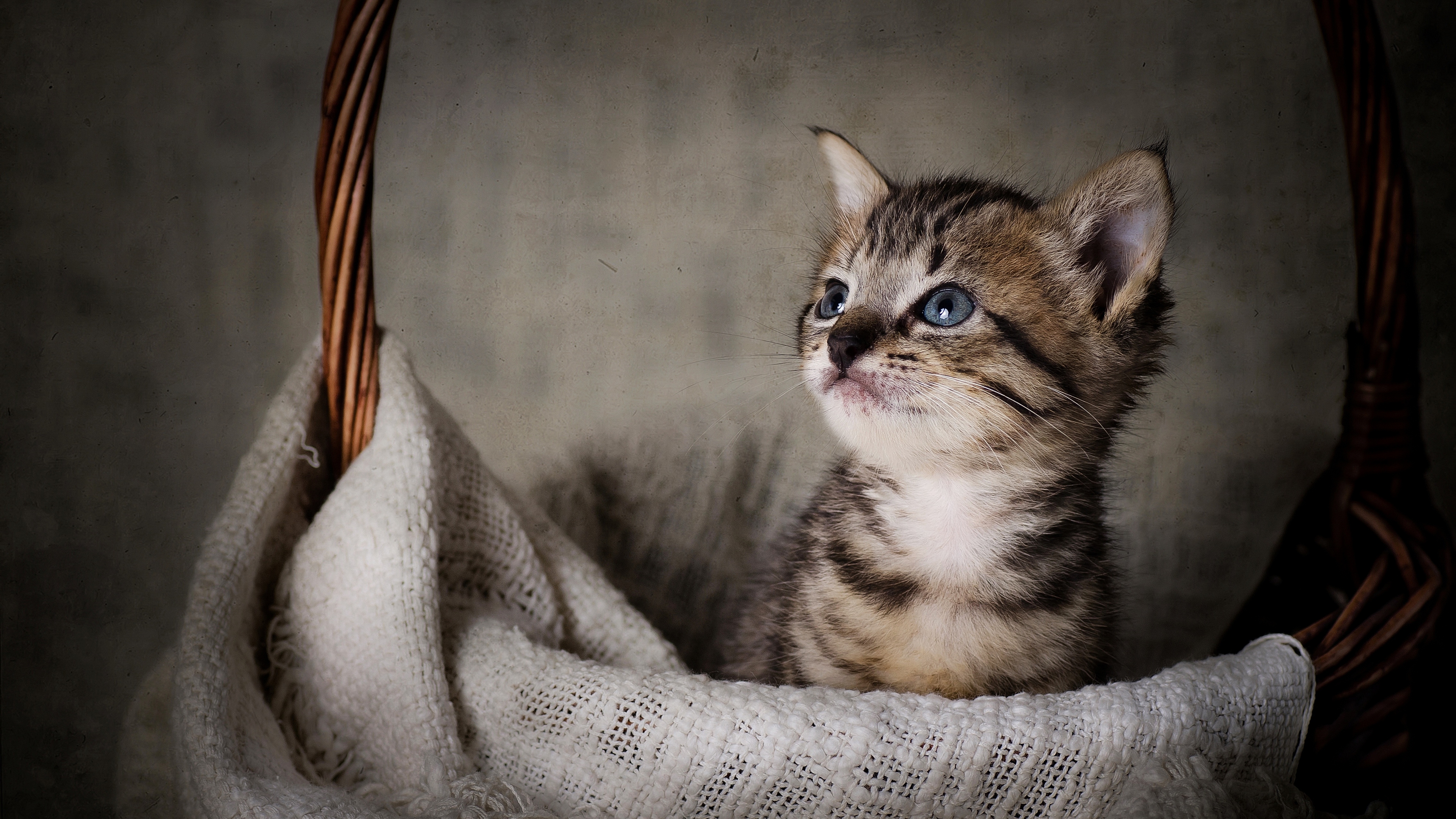 Description: A kitten sitting in a basket with a blanket on it's back and eyes open.