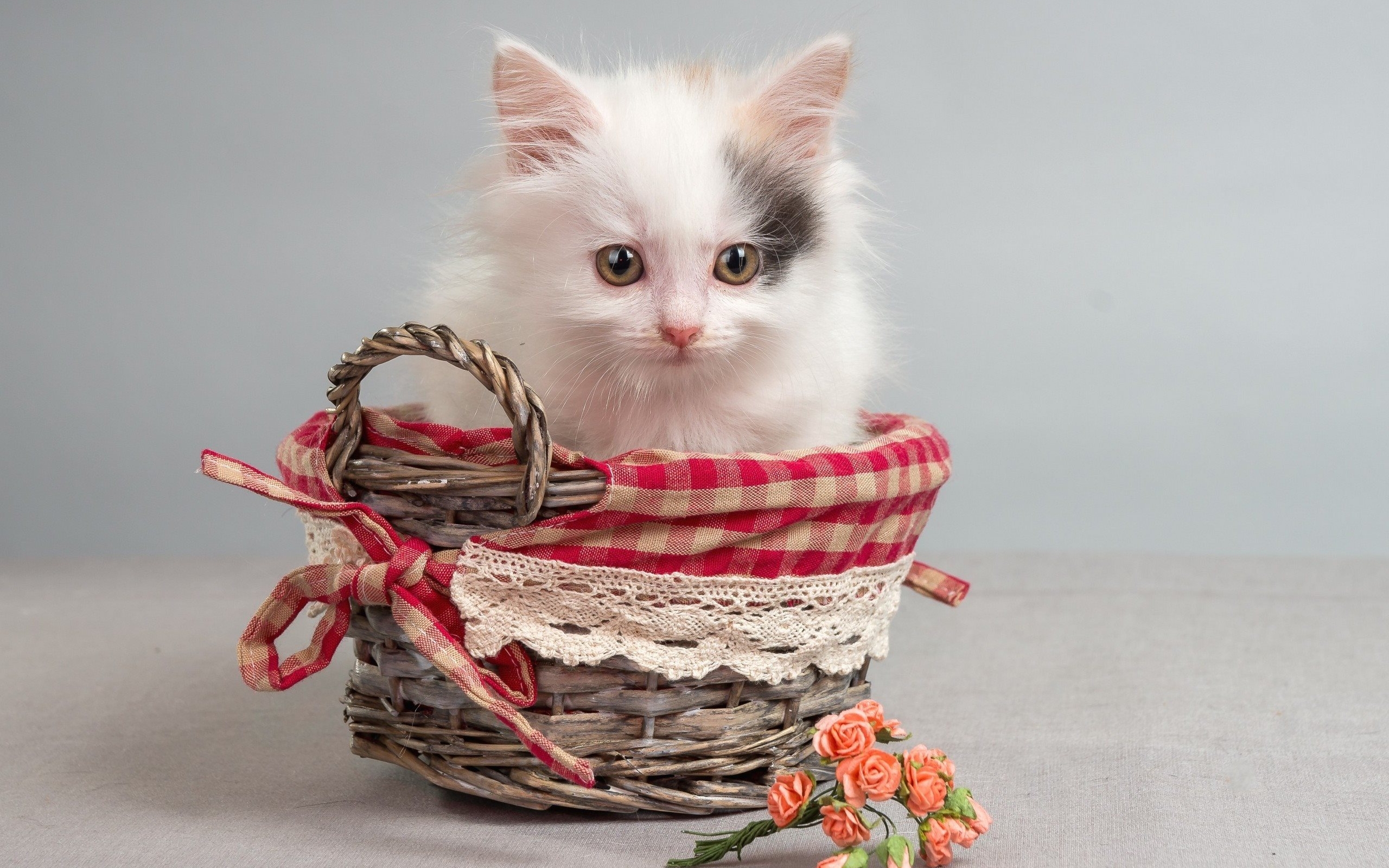 Description: A kitten sitting in a basket with a bow on it's head and a flower in the basket.