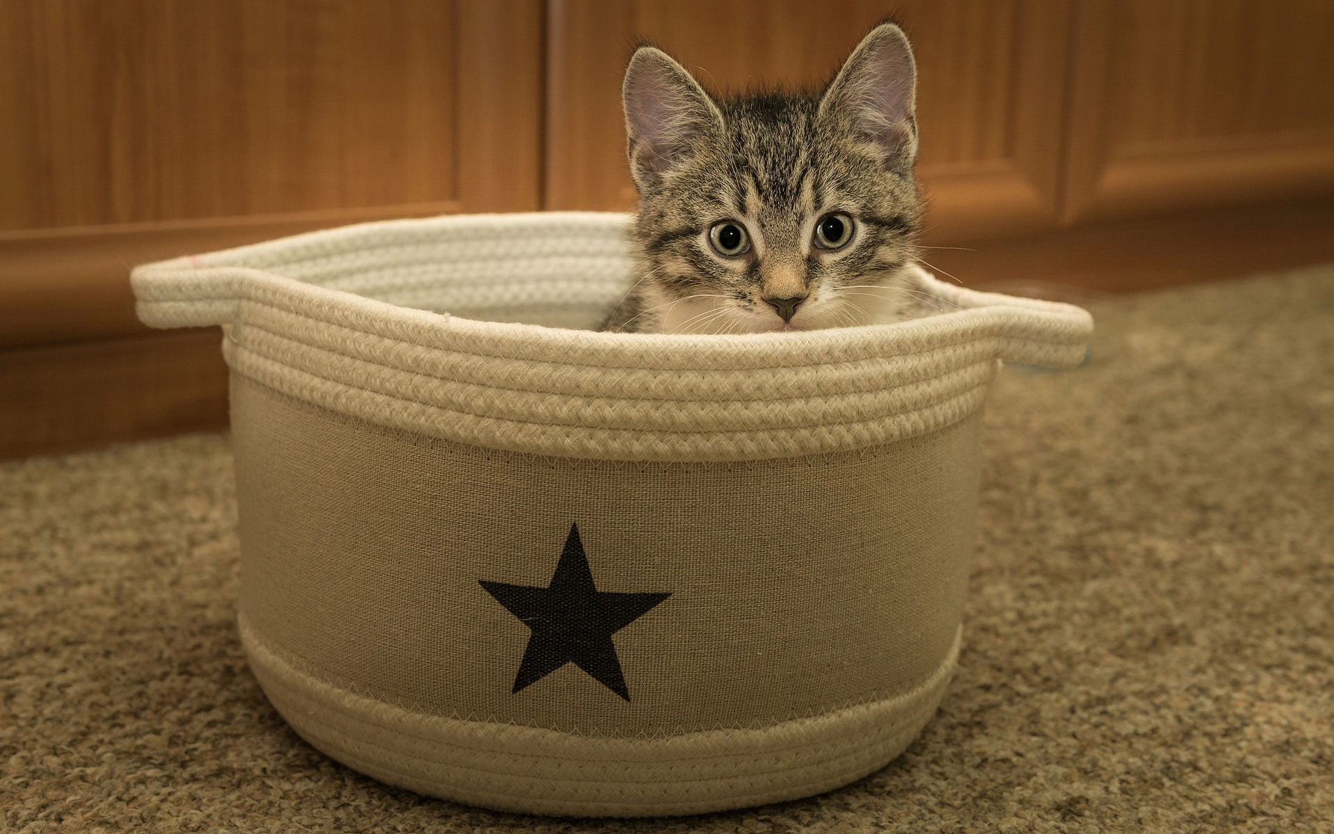 Description: A kitten sitting in a basket on the floor looking at the camera with a surprised look on its face.