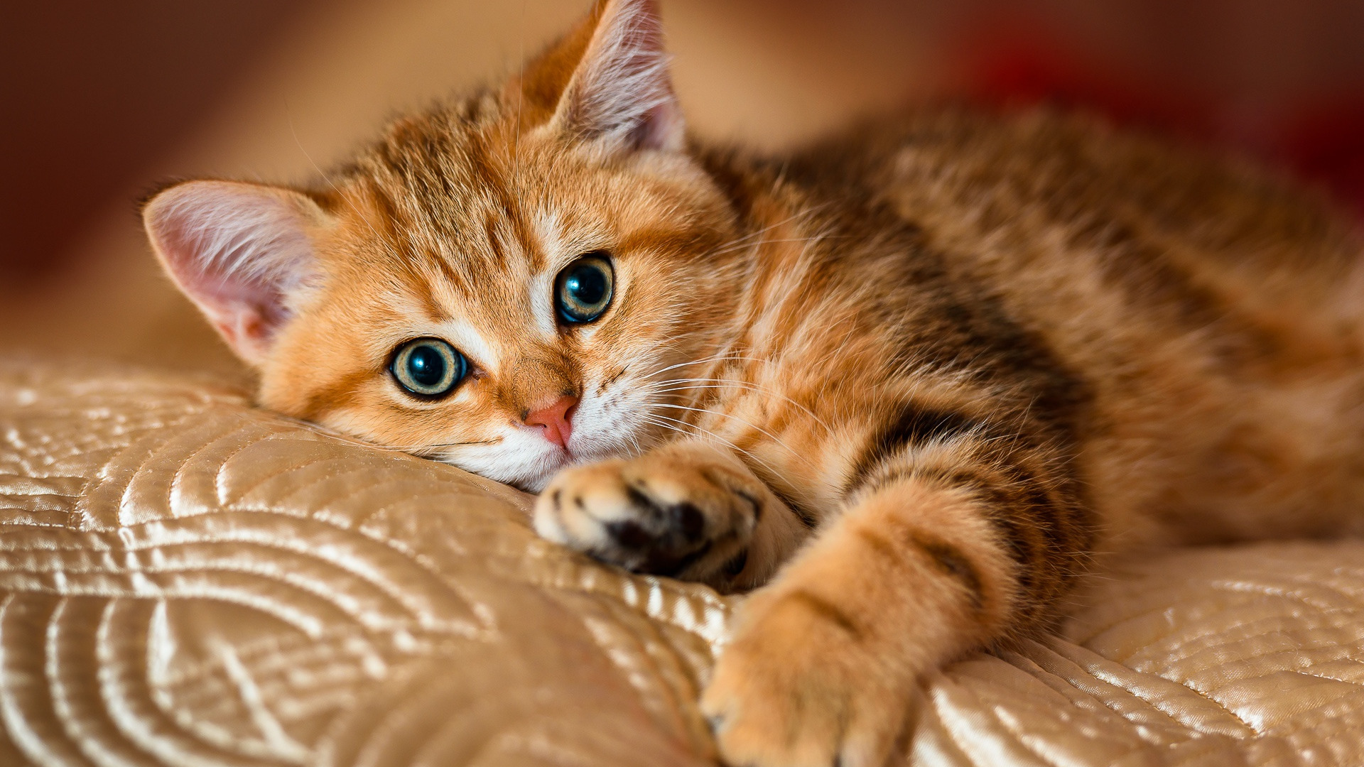Description: A kitten laying on a bed with its paw on the pillow and eyes wide open.