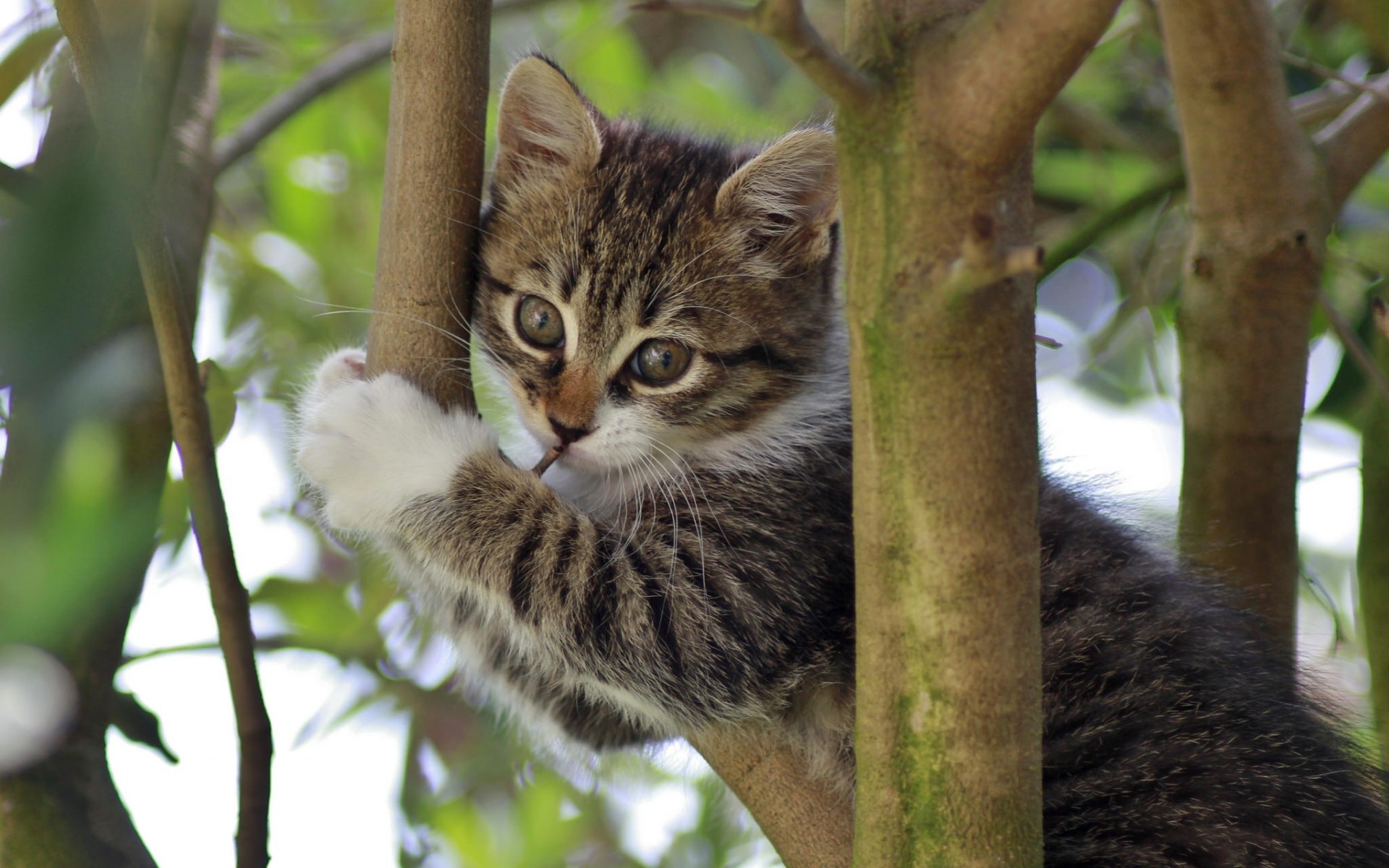 Description: A kitten climbing up a tree branch with its paw on the branch of a tree.