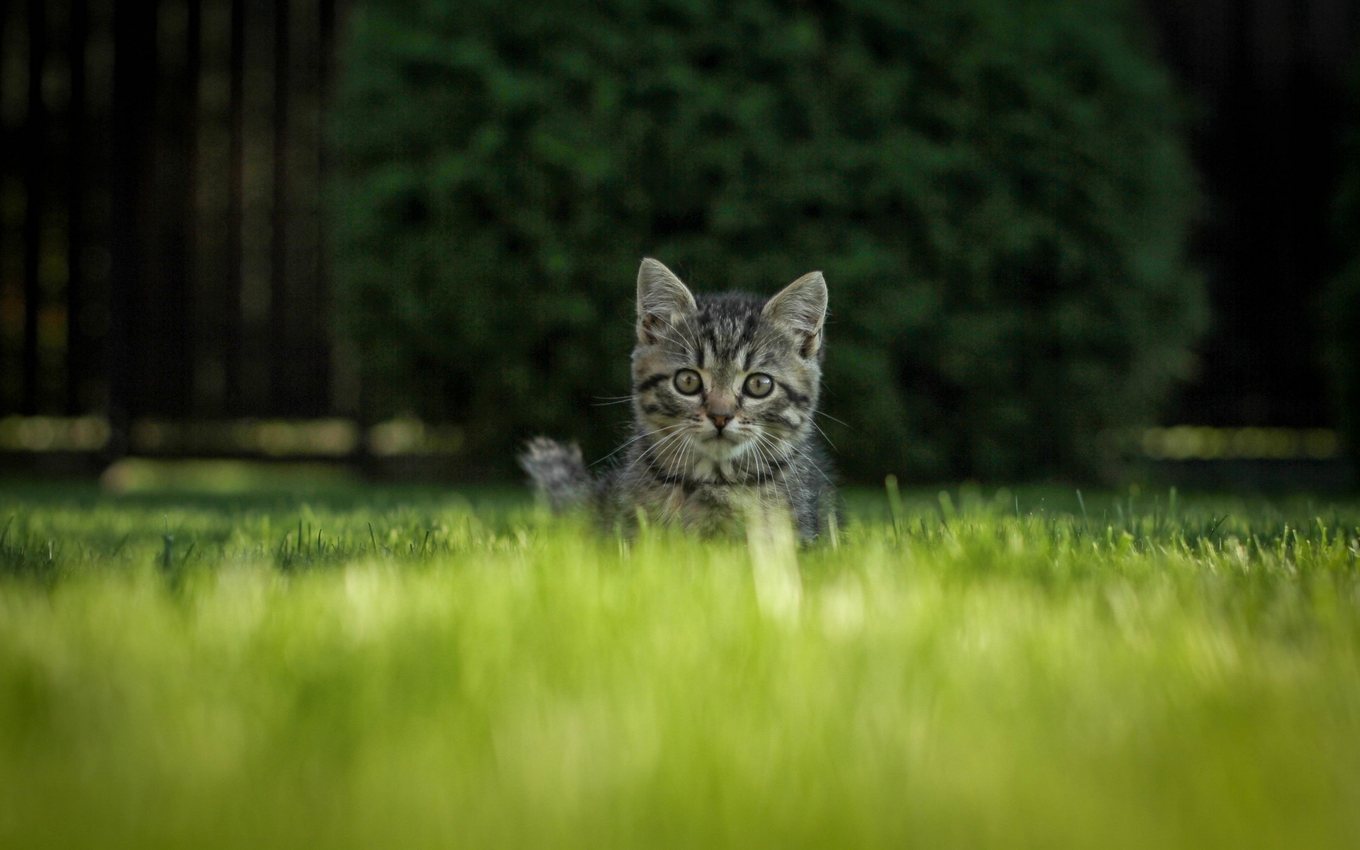 Description: A small kitten is sitting in the grass looking at the camera with a curious look on its face and eyes.