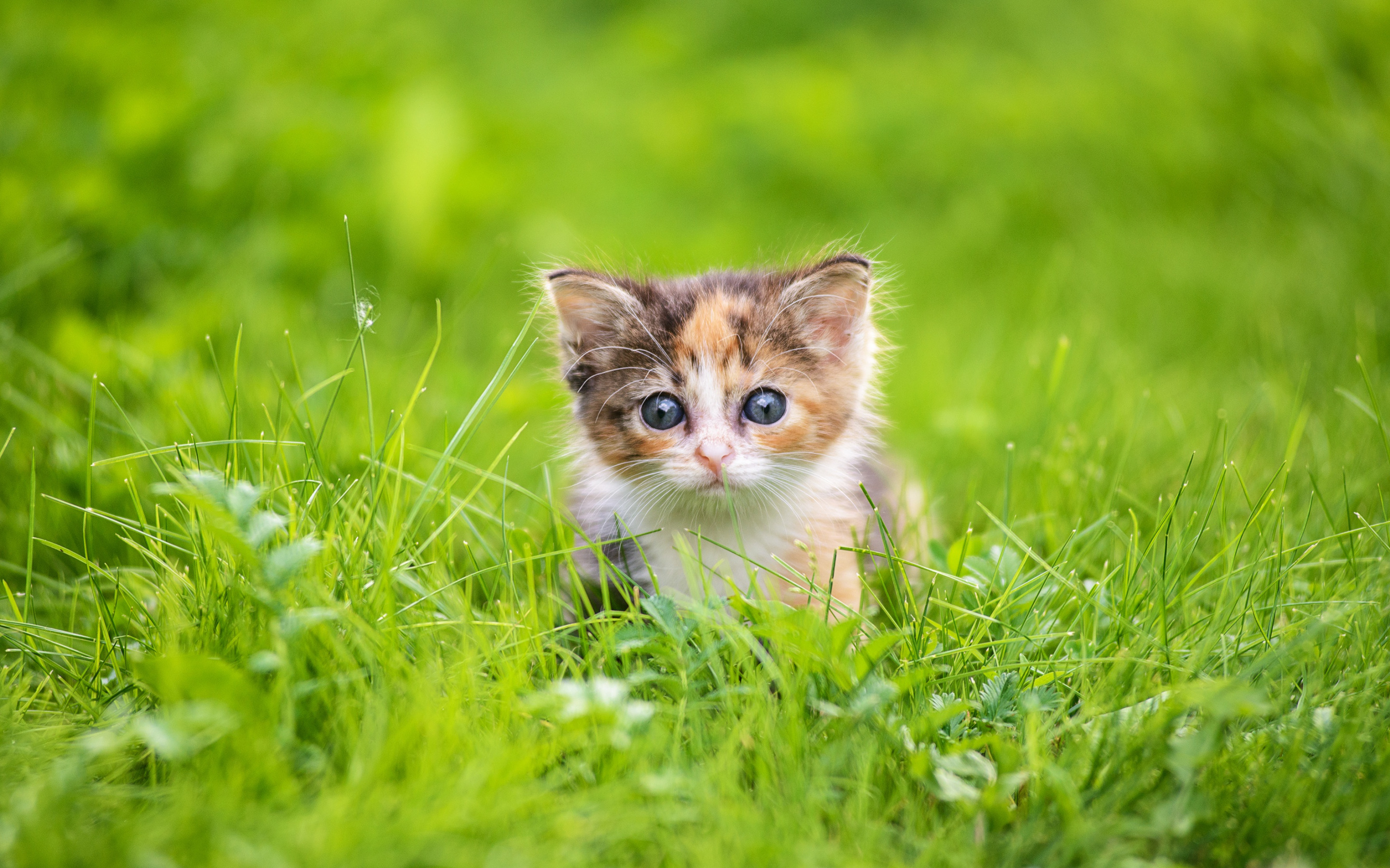 Description: A small kitten is sitting in the grass looking at the camera with a sad look on its face and eyes.