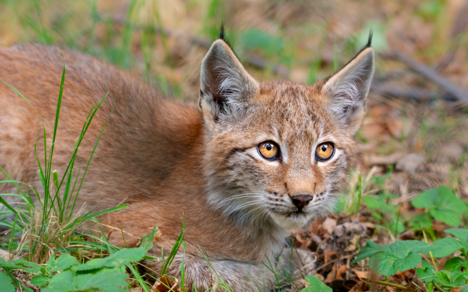 Description: A small kitten is laying in the grass and looking at the camera with a curious look on its face.