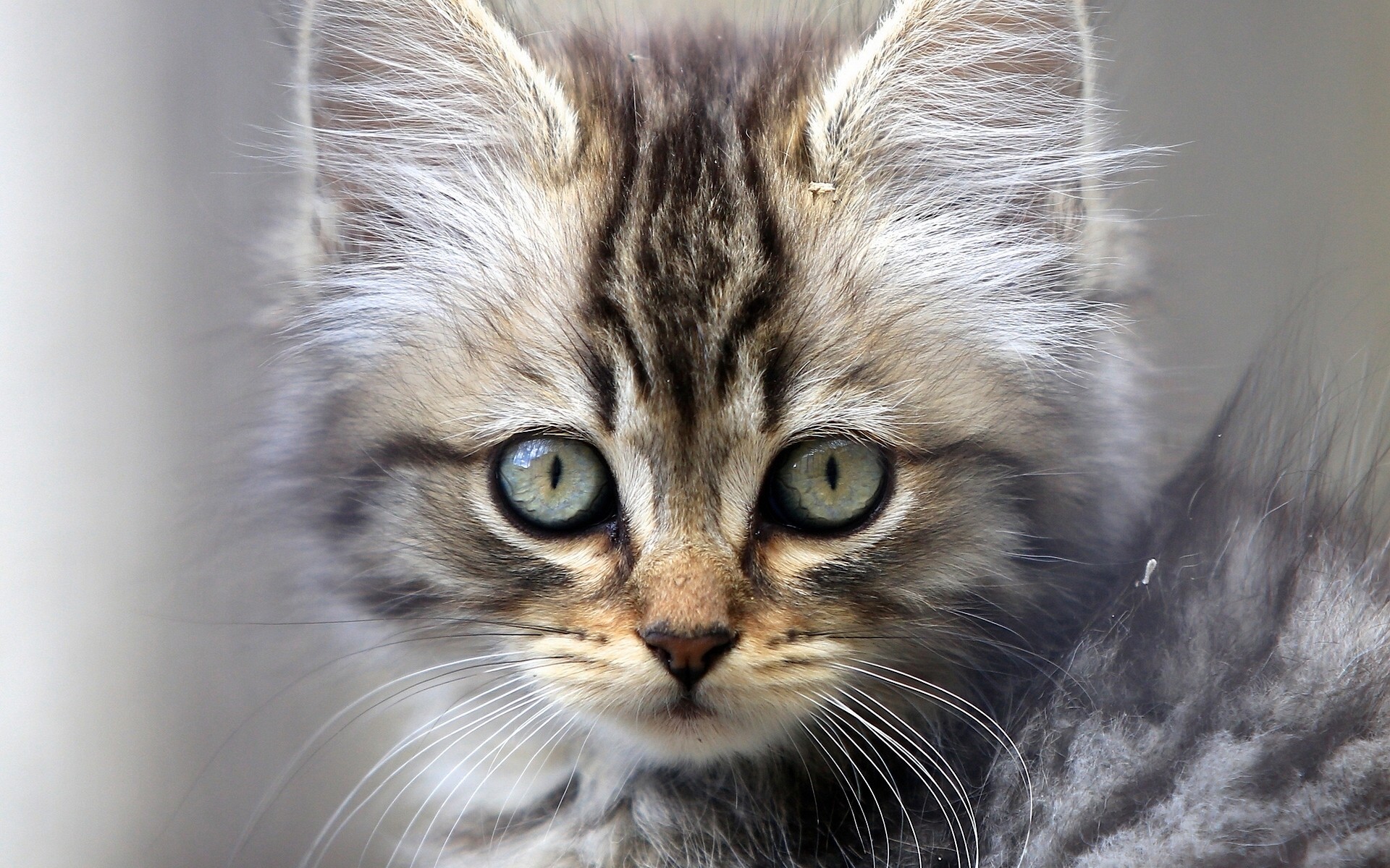 Description: A small kitten with green eyes looking at the camera with a blurry background of the image behind it.