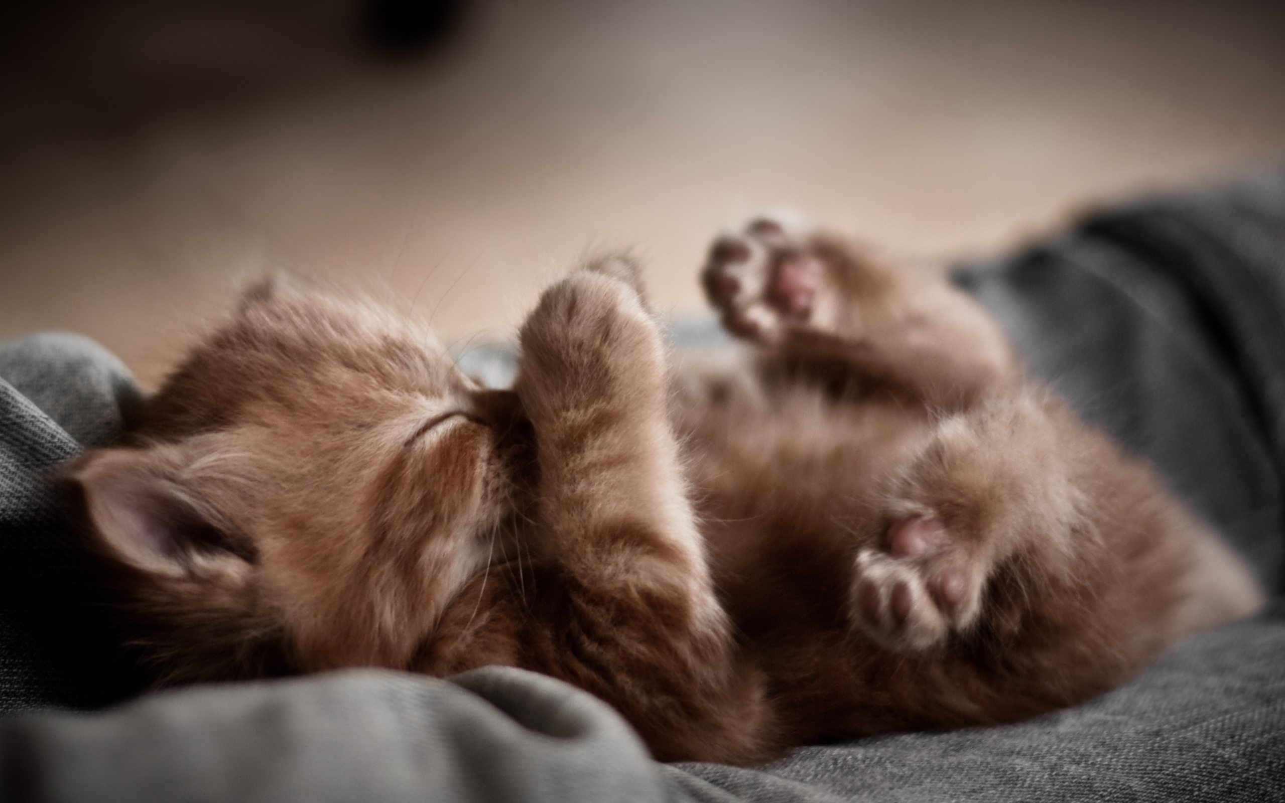 Description: A kitten is laying on its back on a blanket and it's paw is up in the air.