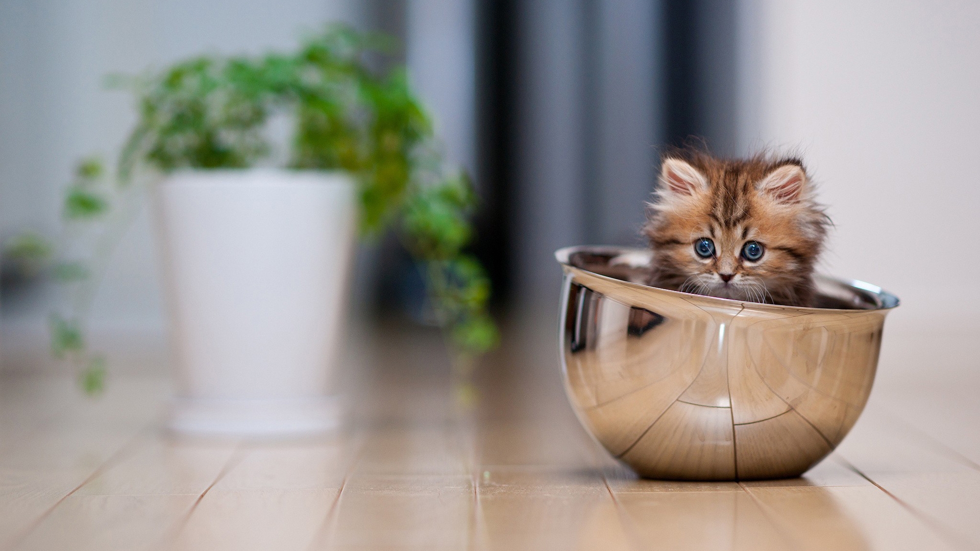 Description: A kitten sitting inside of a metal bowl on a wooden floor next to a potted plant and a potted plant.
