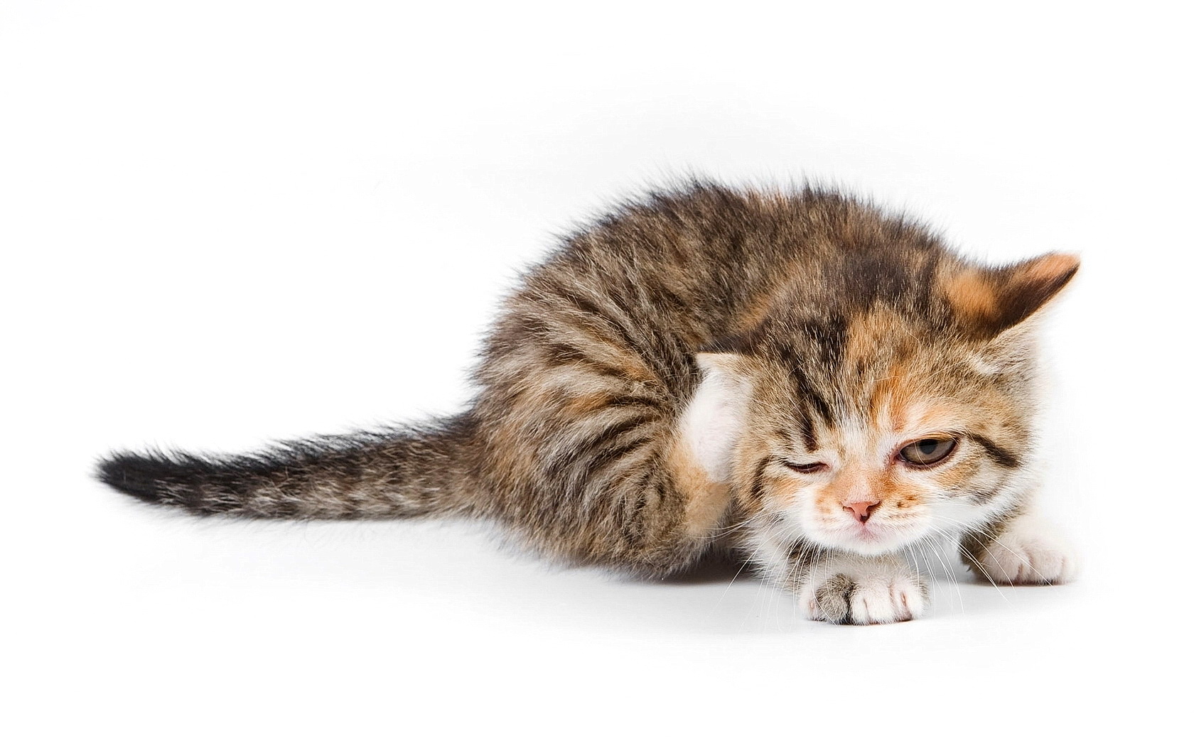 Description: A small kitten is playing with a toy on a white background with a shadow of its head on the ground.