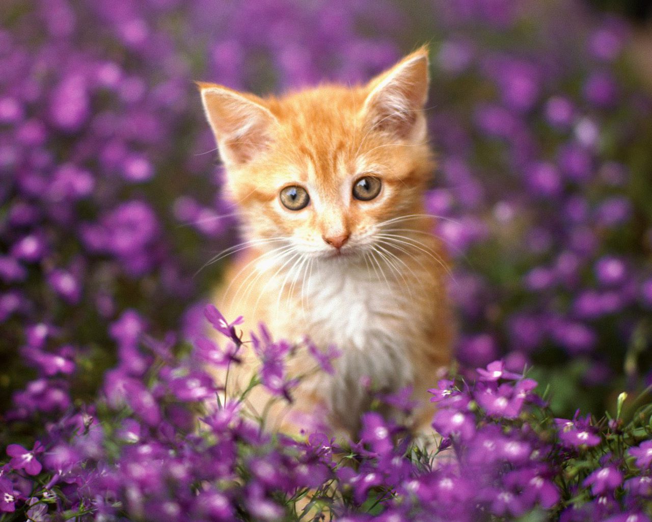 Description: A small kitten sitting in a field of purple flowers with a green eyed look on its face and eyes.