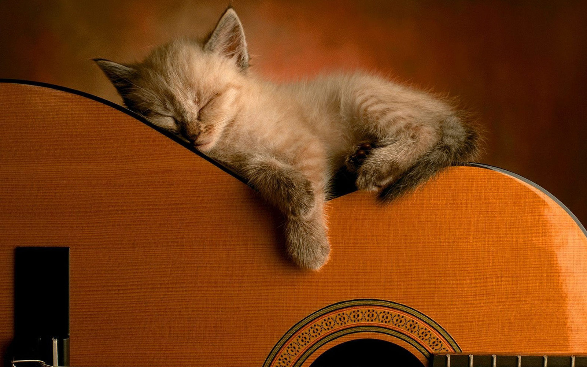 Description: A kitten sleeping on top of a guitar with its head on the guitar's neck and head on the guitar.
