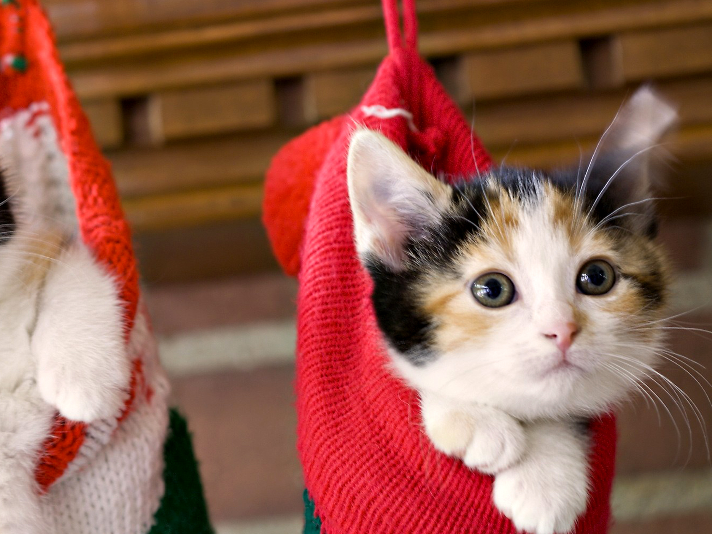 Description: A kitten in a sweater is sitting in a bag and another kitten is sitting in a bag and another cat is looking up.