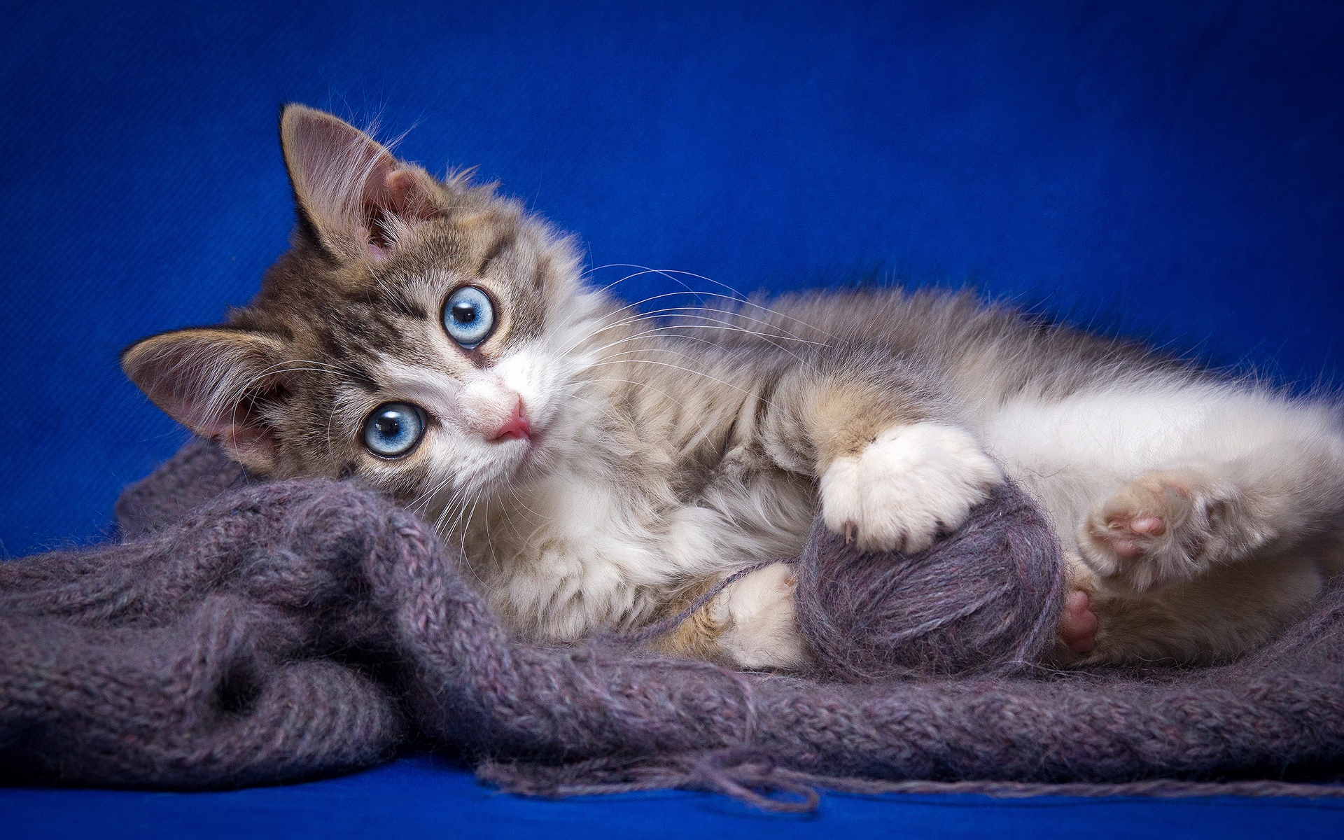 Description: A kitten laying on top of a pile of yarn on a blue background with a blue eyeball in the middle.